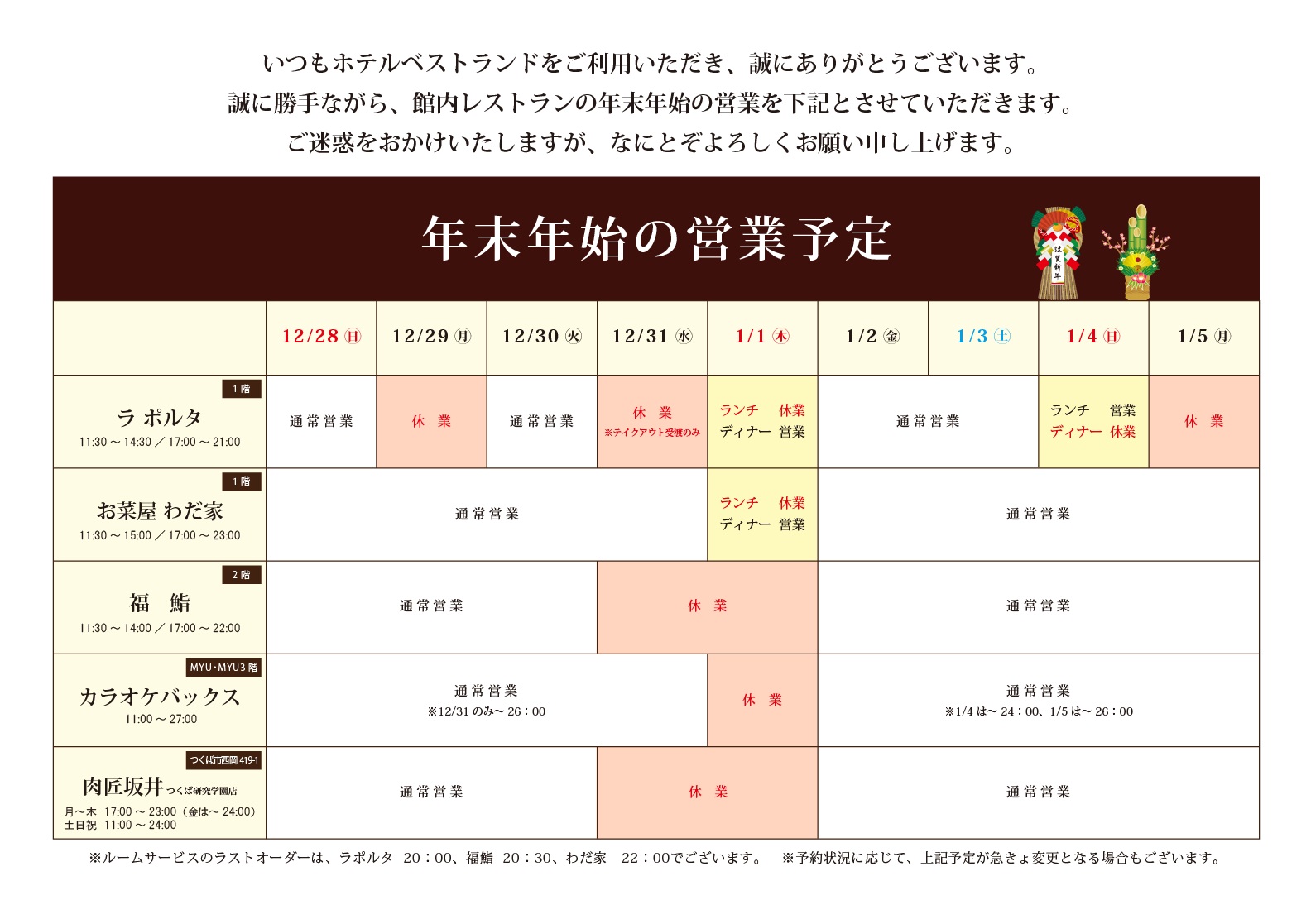 【館内レストラン】年末年始の営業予定