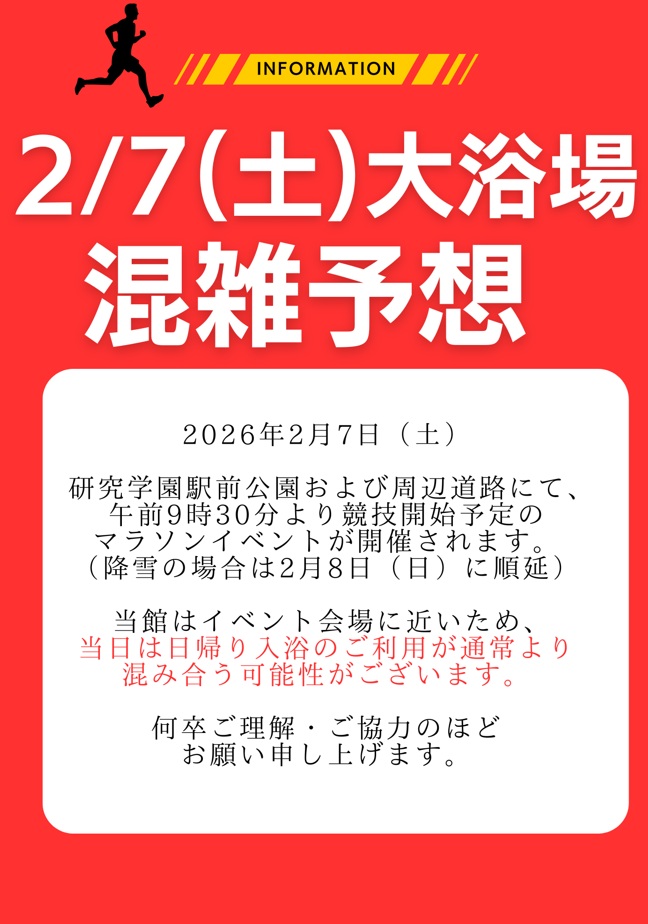 マラソン参加者のご来館により、日帰り入浴が混雑する見込みでございます。